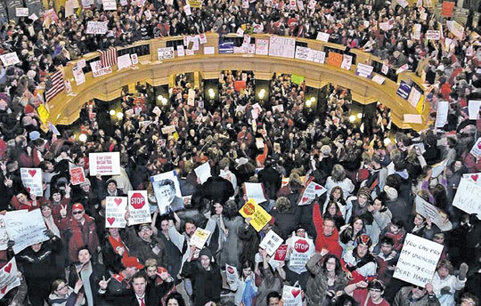 지난 주에 있었던 위스콘신 주지사의 복지 혜택 삭감과 노조 단체 협상권을 제한하려는 시도에 대한 공무원 노조들의 시위는 1970년대 미국을 휩쓸었던 베트남 반전 운동 이후 좀처럼 볼 수 없었던 모습입니다.