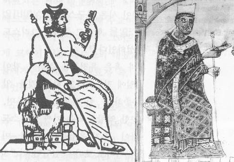 그리고 야누스가 달모양의 모자를 쓰고 작대기를 들고 있는데, 교황도 저런 모자를 쓰고 저런 작대기를 듭니다. 야누스와 교황을 비교해 보면, 교황이 명백히 야누스를 흉내내고 있다는 것을 알 수 있습니다. 또 야누스 그림에 닭이 나왔듯이 야누스를 상징하는 동물은 닭입니다. 왜냐하면 야누스가 문을 여는 자이므로 하루를 여는 닭에 비견되는 것입니다. 닭 또한 역사적으로 가톨릭의 상징이었는데, 가톨릭의 핑계는 베드로가 닭이 울 때 예수님을 부정했는데, 교황은 베드로의 후계이므로 닭을 걸어 놓는 것이 전통이 되었다고 합니다. 그러나 야누스의 그림에서 보시다시피 가톨릭이 종탑에 닭을 달아놓은 것은 사람들에게 야누스를 숭배하게 하려는 목적에서 비롯됐던 것입니다.