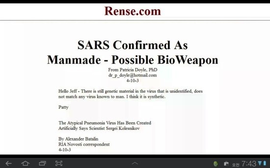 생화학 무기로 실험실에서 개발된 SARS와 AIDS 바이러스가 특정한 목적에 의해 전파되고 있다고