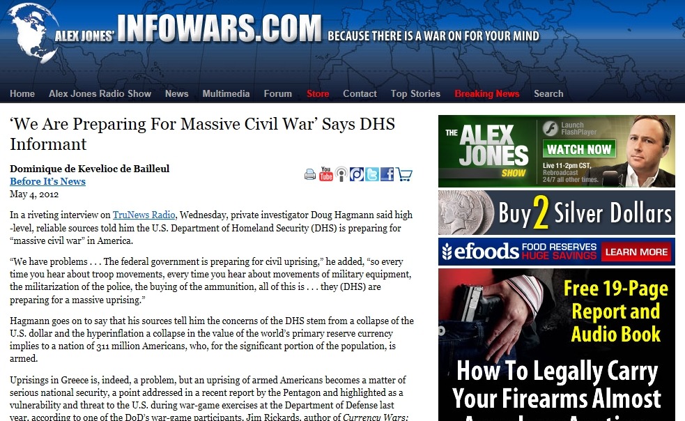 그는 믿을 만한 정보를 제공해 주는 고위직에 있는 사람으로부터 DHS(Department of Homeland Security, 국내 보안부라고나 할까요)라는 기관에서 대규모 시민 전쟁의 발발을 준비하고 있다는 정보를 알게 되었다는 것입니다. 현재 미국에서 행해지고 있는 군대의 움직임인나 경찰의 군대화, 그리고 비 상식적인 탄약의 수입 등이 달러의 폭락과 함께 엄청난 인플레이션이 발생하면서 이루어질 시민 폭동을 예비하여 준비하고 있다는 것입니다.